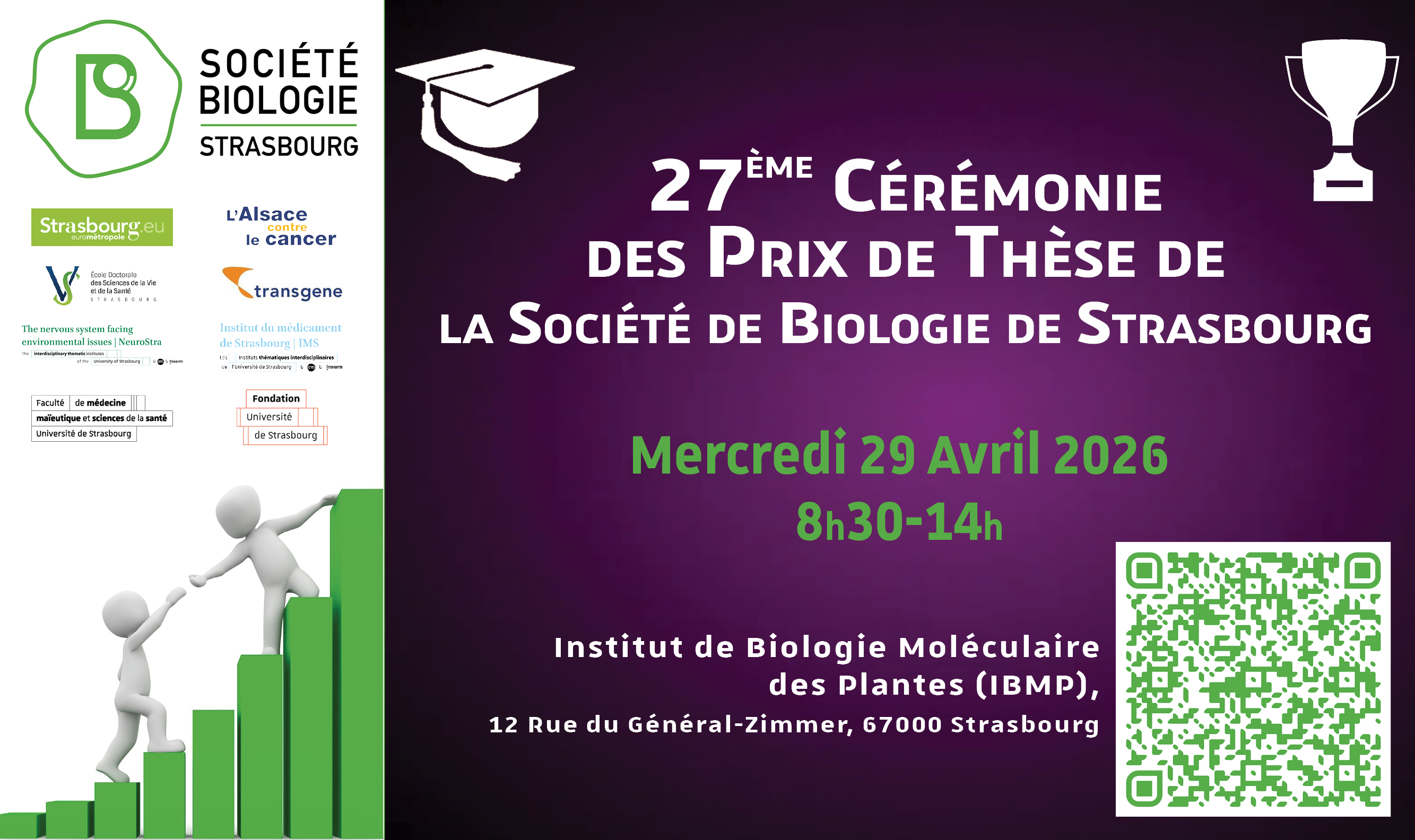 La vingt-septième Cérémonie des Prix de Thèse de la Société de Biologie de Strasbourg (SBS) se tiendra le mercredi 29 avril 2026 dans l’auditorium de l’Institut de Biologie Moléculaire des Plantes (IBMP), 12 Rue du Général-Zimmer à Strasbourg, de 8h30 à 14h.